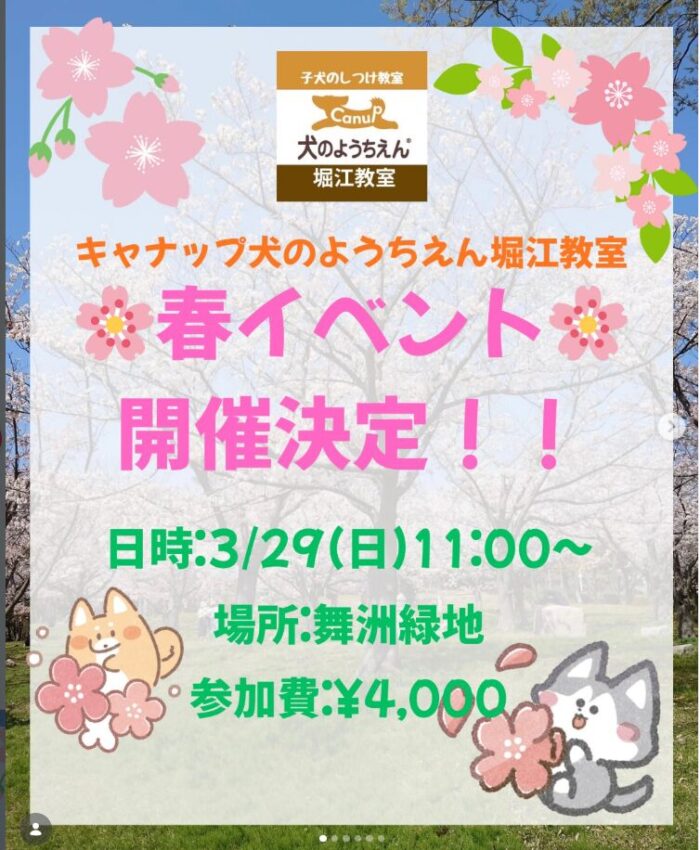 キャナップ犬のようちえん堀江教室 お待ちかねの春イベント🌸お花見遠足イベントのご案内 今年はお花見遠足イベントを開催いたします✨ みんなで桜を見なが……